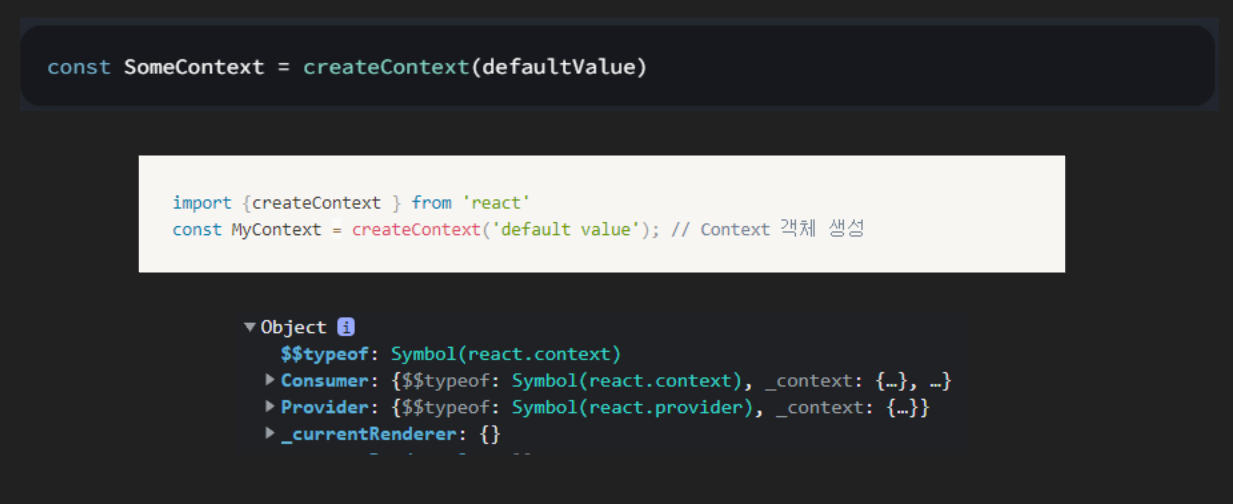 이미지를 보다시피 `createContext`를 사용해 `MyContext`라는 Context 객체를 생성하였습니다. 코드가 적힌 아래 부분 보시면 `MyContext` 객체는 `Consumer`, `Provider`라는 객체를 확인할 수 있습니다. 해당 객체는 리액트의 컴포넌트입니다.