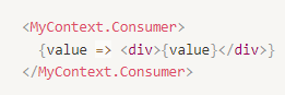 위 코드에서 `{value => <div>{value}</div>}`부분을 볼 수 있듯이 Context.Consumer의 자식은 반드시 함수여야하며 context의 현재값을 받고 React 노드를 반환합니다.
