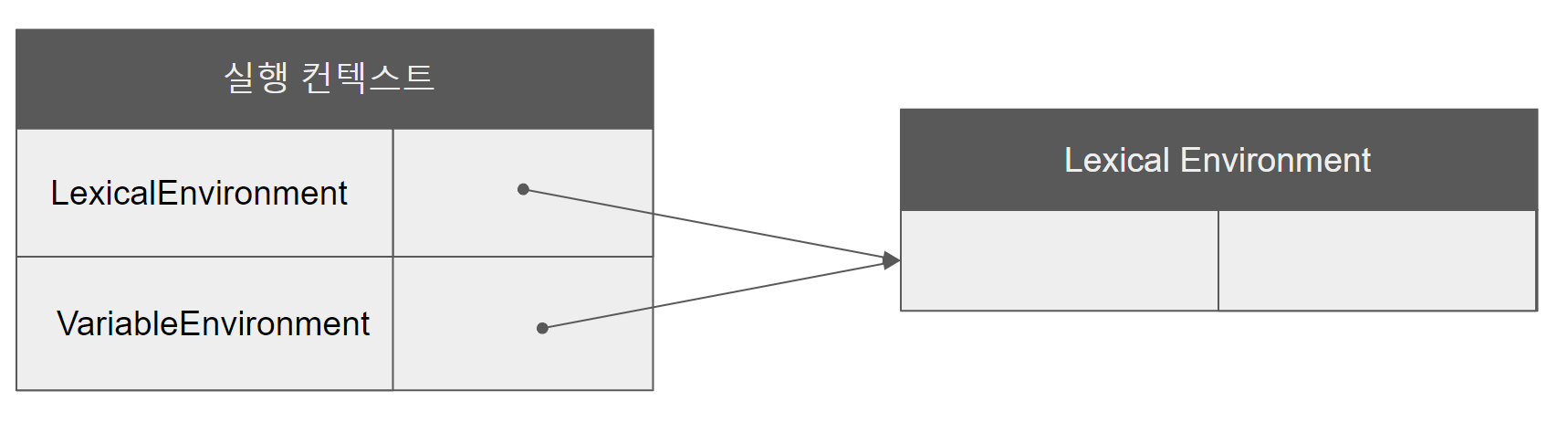 실행 컨텍스트는 실행할 코드에 제공할 환경 정보들을 모아놓은 객체로 VariableEnvironment, LexicalEnvironment, ThisBinding으로 구성되어 있습니다. 그 중 렉시컬 환경(Lexical Enviroment)은 키와 값을 갖는 객체 형태의 스코프를 생성하여 식별자를 키로 등록하고 식별자에 바인딩된 값을 관리하는 저장소 역할을 하며 렉시컬 스코프의 실체입니다. 실행 컨텍스트가 초기에 생성될 때 LexcialEnviroment 컴포넌트와 VariableEnviroment 컴포넌트는 하나의 동일한 렉시컬 환경을 참조합니다.