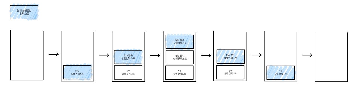 위 코드를 실행하면 코드가 실행되는 시간의 흐름에 따라 콜스택에는 다음과 같이 실행 컨텍스트가 추가(push)되고 제거(pop)됩니다.