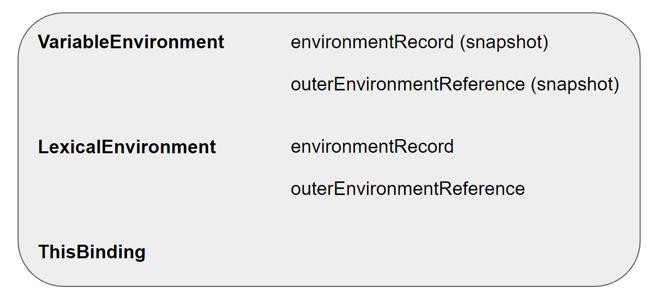 이 때 VariableEnvironment에 담기는 내용은 LexicalEnvironment와 같지만 최초 실행 시의 스냅샷을 유지한다는 점이 다릅니다. 실행 컨텍스트를 생성할 때 VariableEnviroment에 정보를 먼저 담은 다음, 이를 그대로 복사해서 LexicalEnviroment를 만들고 이후에 LexicalEnviroment를 주로 활용하게 됩니다. 즉, 초기화 과정 중에는 사실상 완전히 동일하고 이후 코드 진행에 따라 서로 달리지게 됩니다.