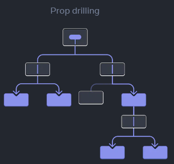 리액트에서 컴포넌트 간 데이터를 주고 받을 때 상위 컴포넌트에서 하위 컴포넌트로 “props”를 전달받습니다. 하지만 이렇게 “props”를 전달하는 방법은 상위 컴포넌트에서 하위 컴포넌트로 데이터를 전달할 때 여러 컴포넌트를 거치게 되면서 특정 컴포넌트는 해당 데이터를 필요하지 않아 “props”를 하위 컴포넌트로 전달하는 용도로만 쓰이는 컴포넌트들이 생기게 됩니다. 이러한 현상을 “Props Drilling”이라고 합니다. 그림으로 살펴보면 더 명확하게 이해하실 수 있을 겁니다.